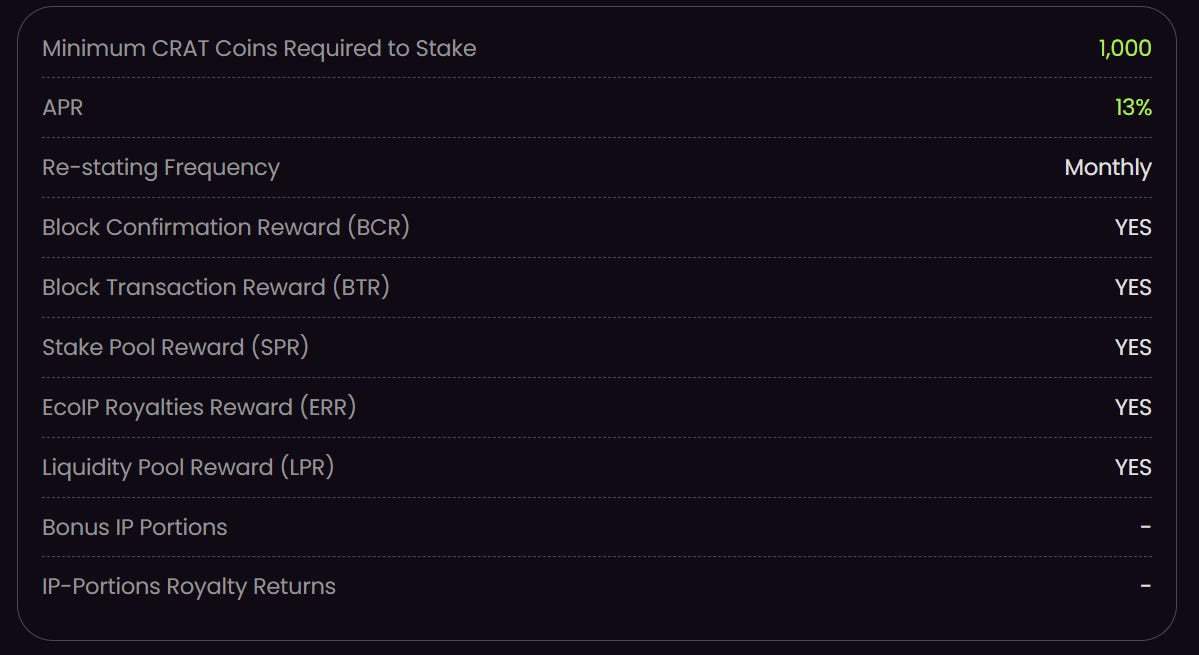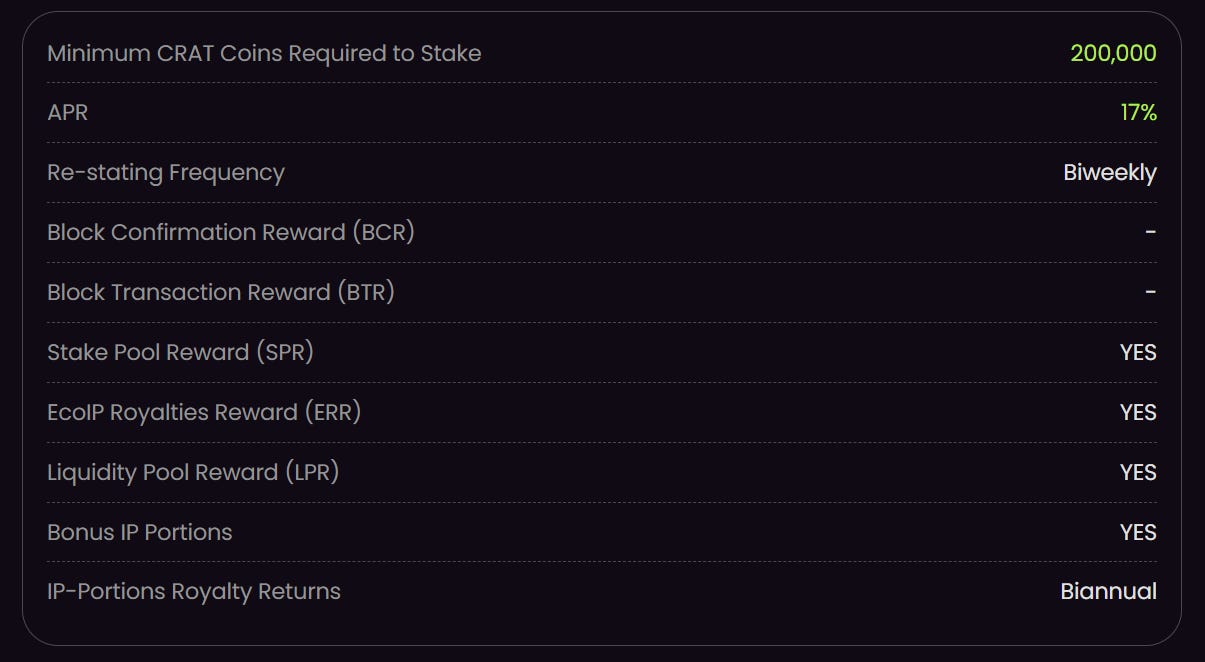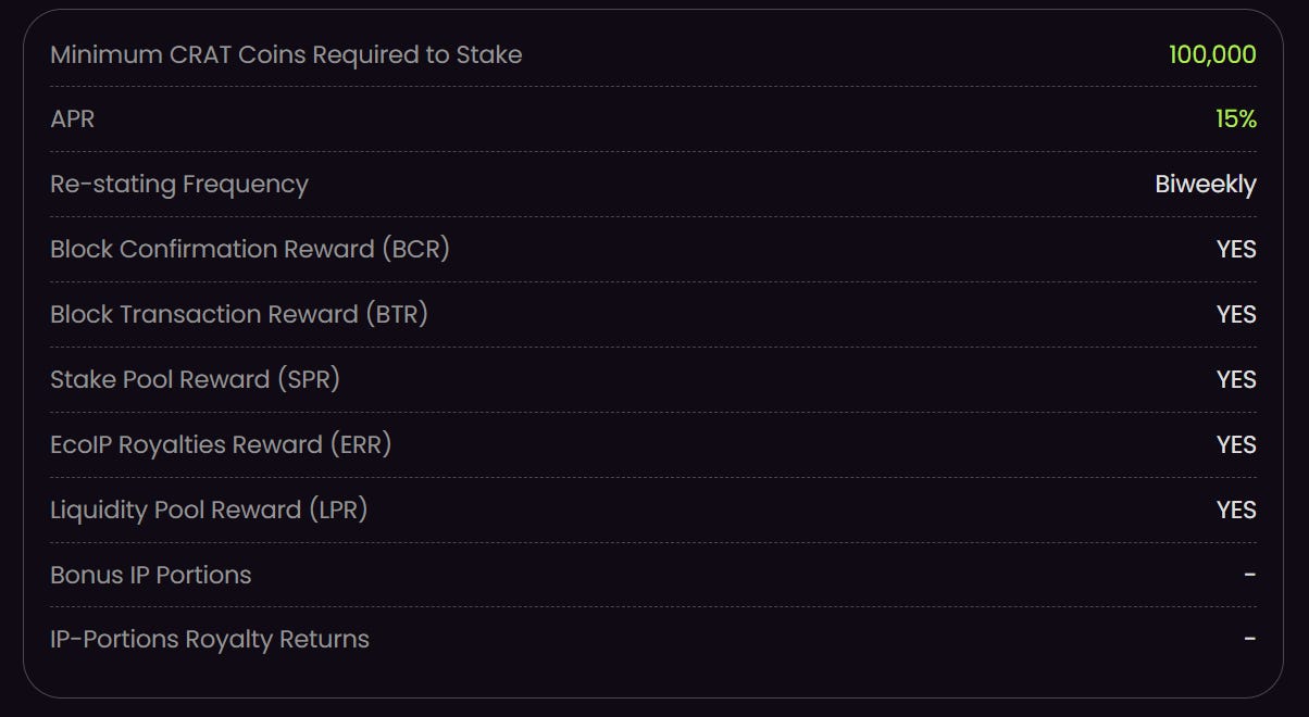 When you hold CratD2C coins in the stakepool for a period of 6 months, you get a share of the income generated by the entire ecosystem’s intellectual property.