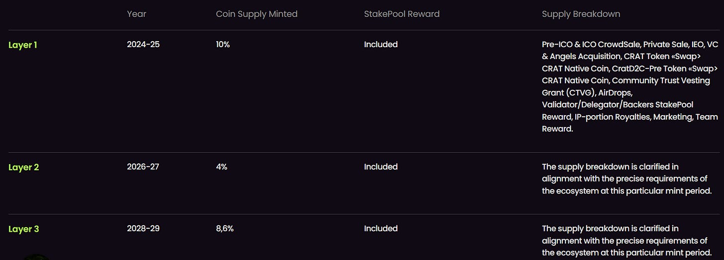 Engineered with precision, the mechanism distributes CRAT native coins in a balanced and controlled manner across eight distinct layers—each tailored to serve a strategic function while maintaining overall ecosystem harmony.